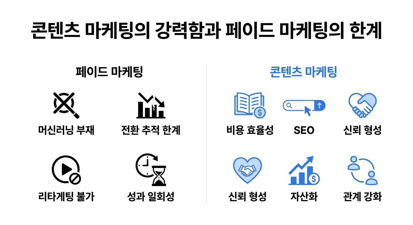 자산화 효과 | 한 번 만든 콘텐츠는 시간이 지나도 유입 지속 | 광고는 멈추면 끝, 콘텐츠는 축적될수록 성장 |